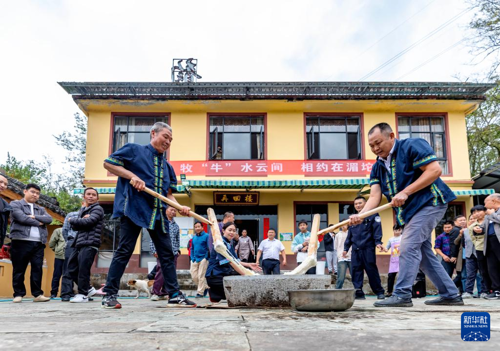 村民在貴州省銅仁市印江土家族苗族自治縣纏溪鎮湄坨村向旅客展示傳統風情(10月2日攝)。
