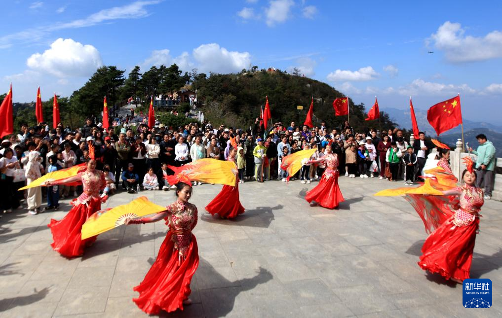 游客在山東省臨沂市沂蒙山銀座天蒙旅游區觀看民俗舞蹈表演(10月1日攝)。