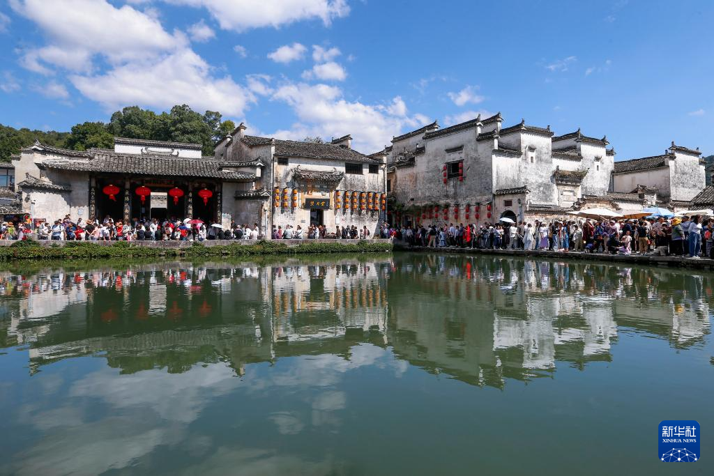 游客在世界文化遺產地安徽省黃山市黟縣宏村游玩(10月3日攝)。