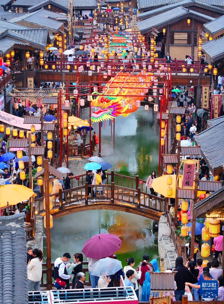 游客在湖南省衡陽市南岳區“南岳里”廟會民俗美食街區游玩,樂享假日美好時光(10月1日攝,無人機照片)。