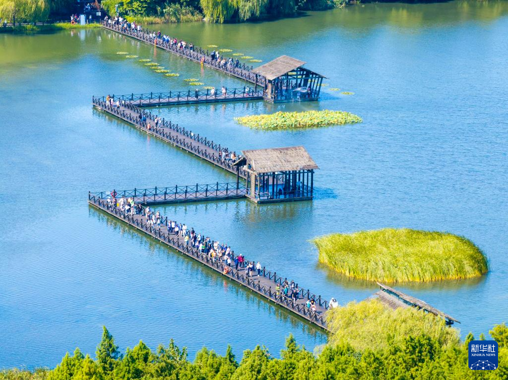 游客在江蘇省泰州市姜堰區溱湖國家濕地公園游玩(10月2日攝,無人機照片)。