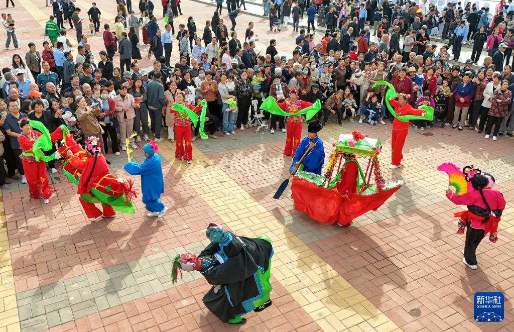 10月10日,觀眾在寶豐縣新世紀廣場觀看鼓兒哼表演(無人機照片)。