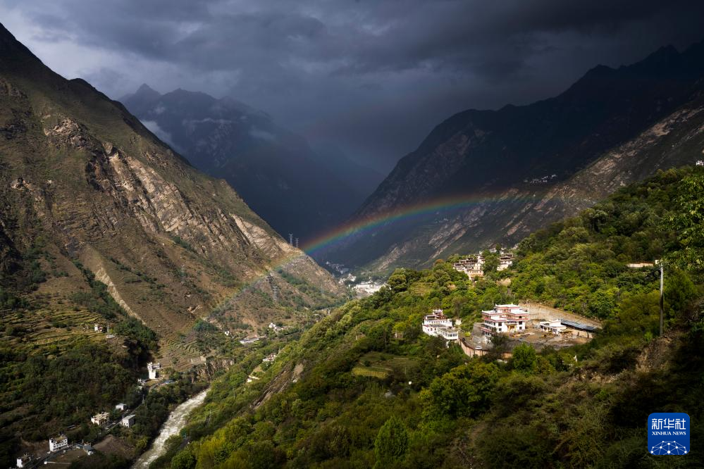 10月11日,雨后彩虹中的丹巴縣中路鄉藏寨。