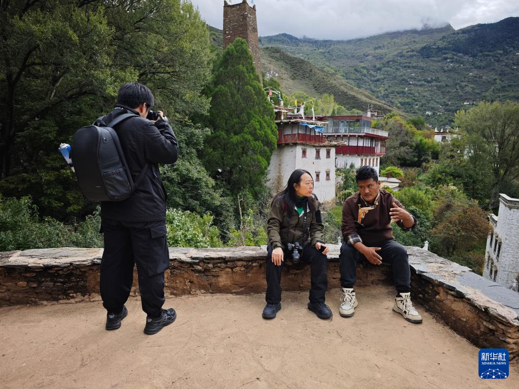 10月11日,川影師生在丹巴縣采訪藏族碉樓主人翁都(右)。