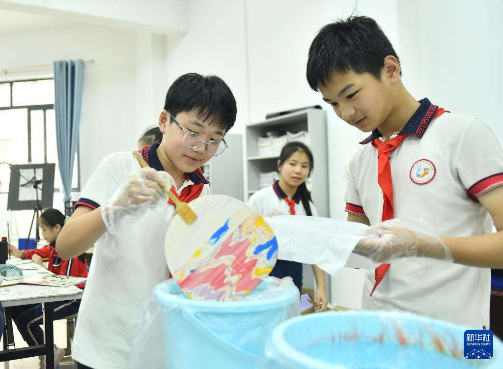 10月10日,在梧州市長洲區鳳翔小學,學生們在非遺課堂上制作漆扇。