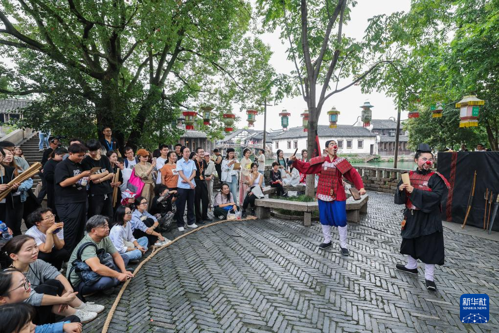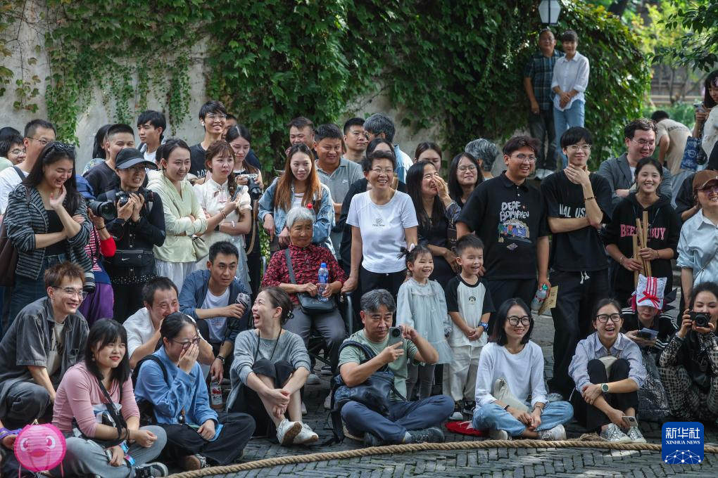 10月17日,游客在烏鎮街頭觀看古鎮嘉年華的演出劇目。