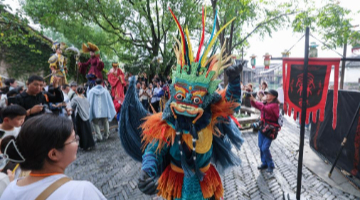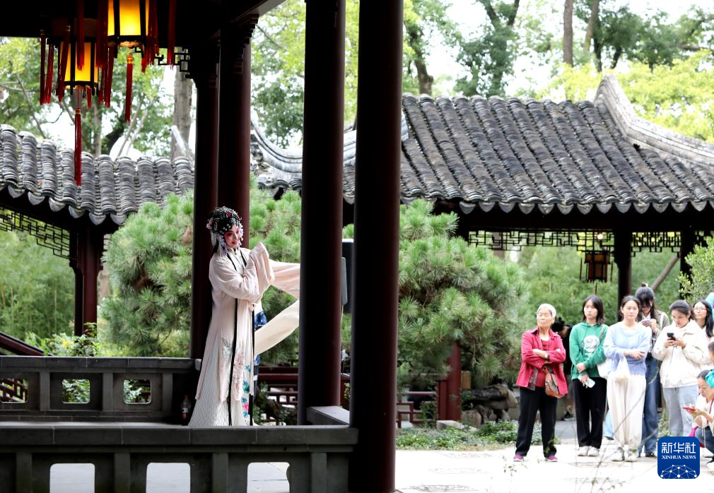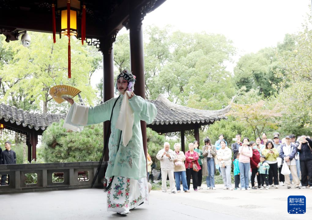 10月19日,演員在蘇州虎丘山景區為游客表演昆曲。