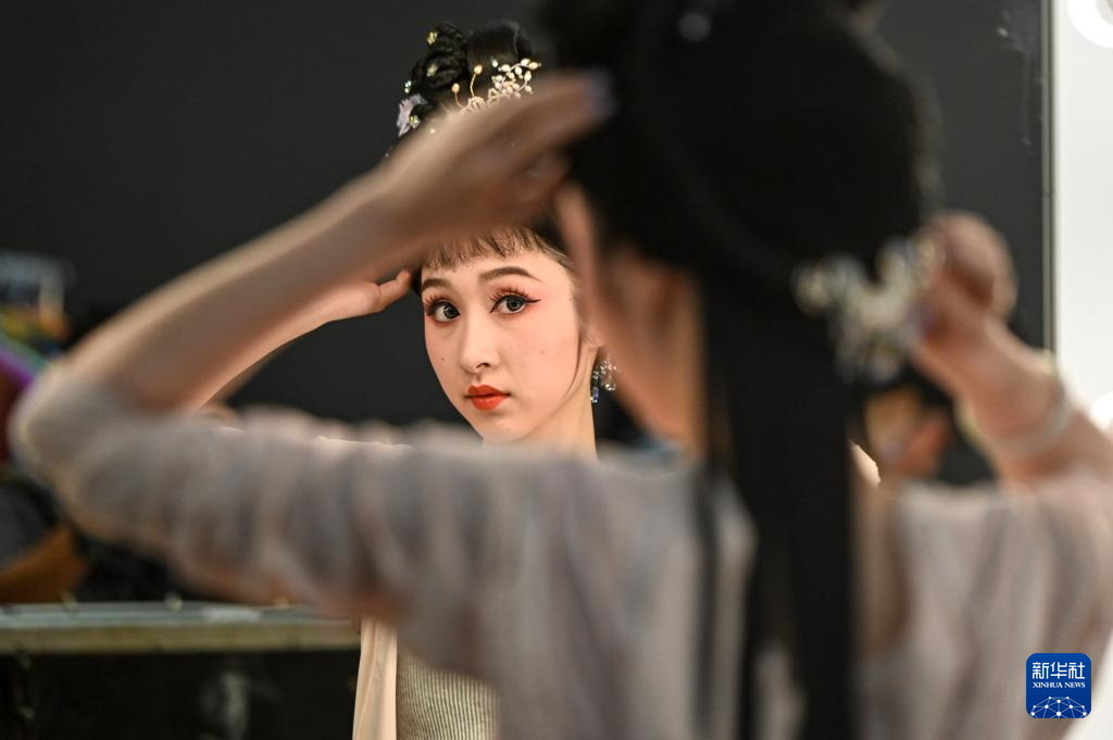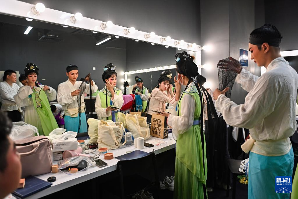 10月18日,在馬來西亞吉隆坡,錫劇《追香記》的演員在后臺做表演前的準備。