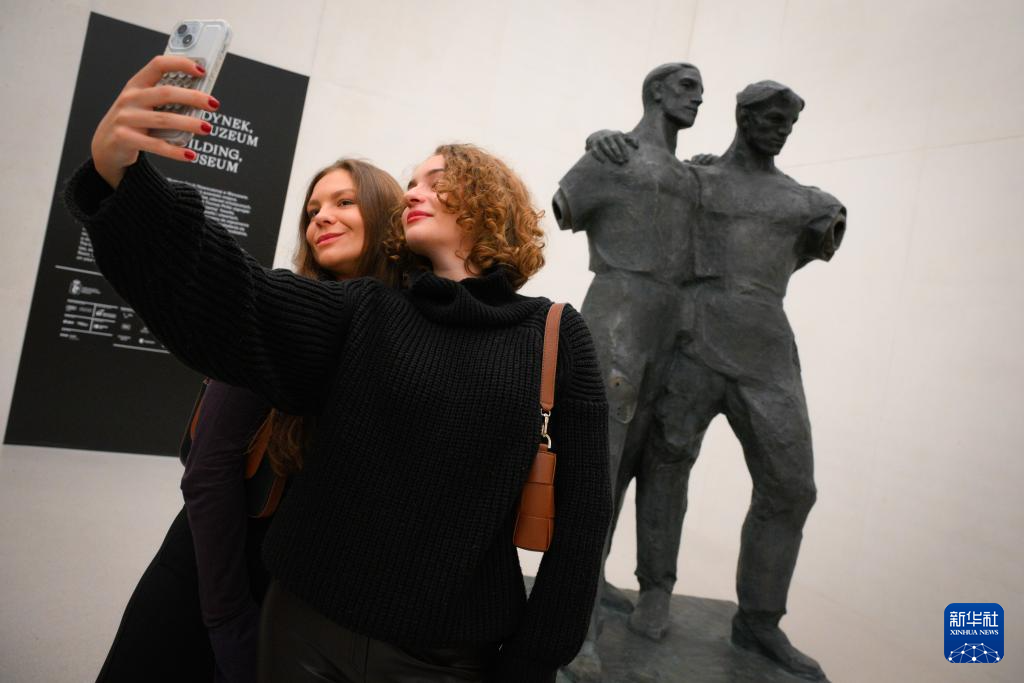 10月25日,兩名游客在波蘭華沙現代藝術博物館新館中的一處雕塑前留影。