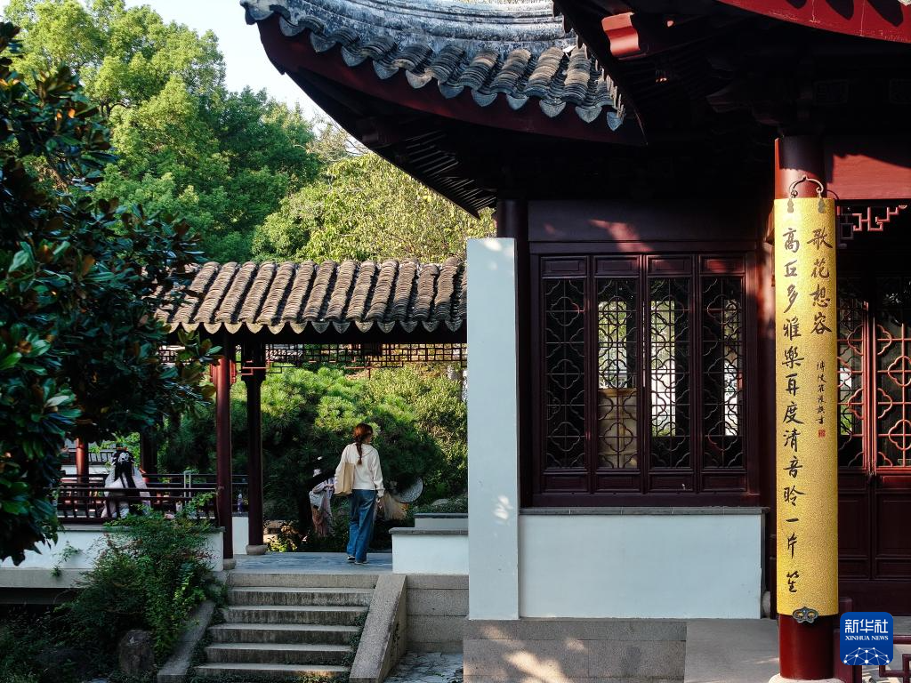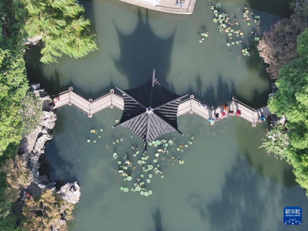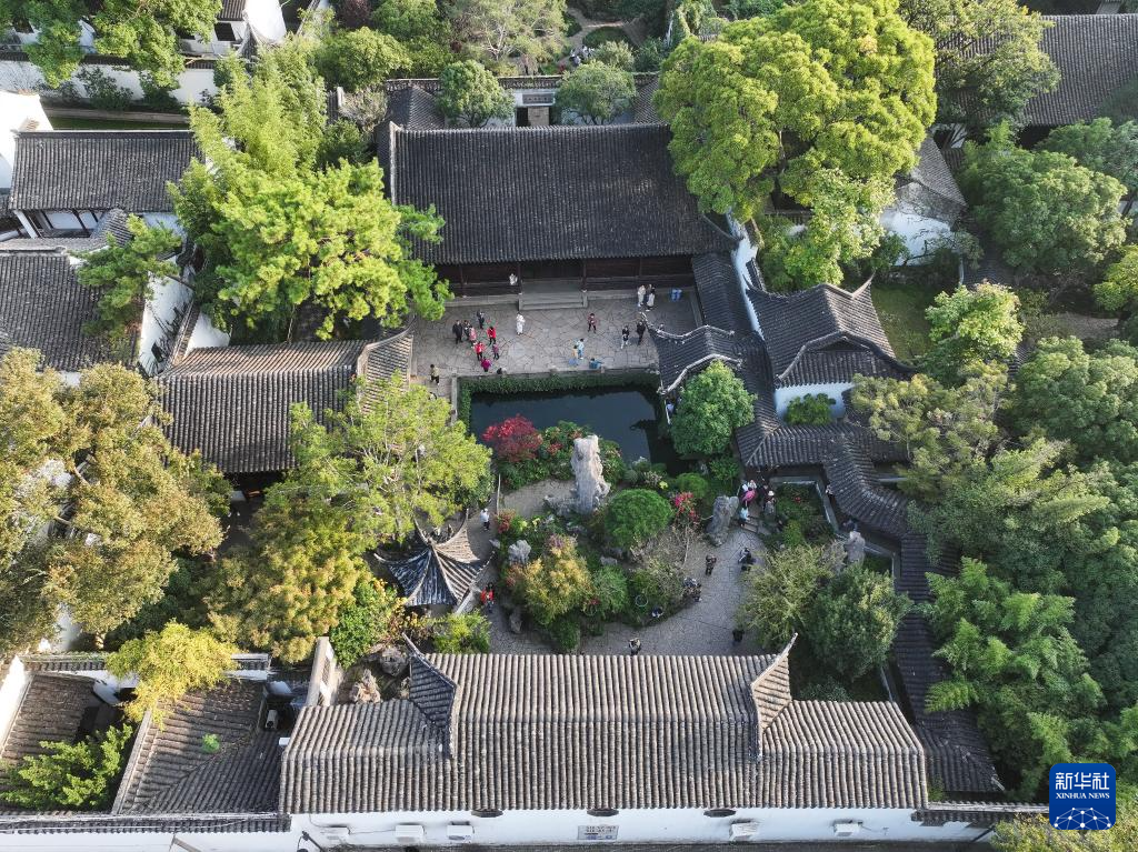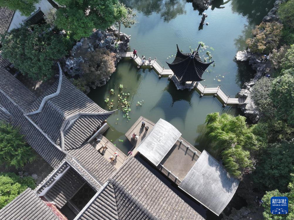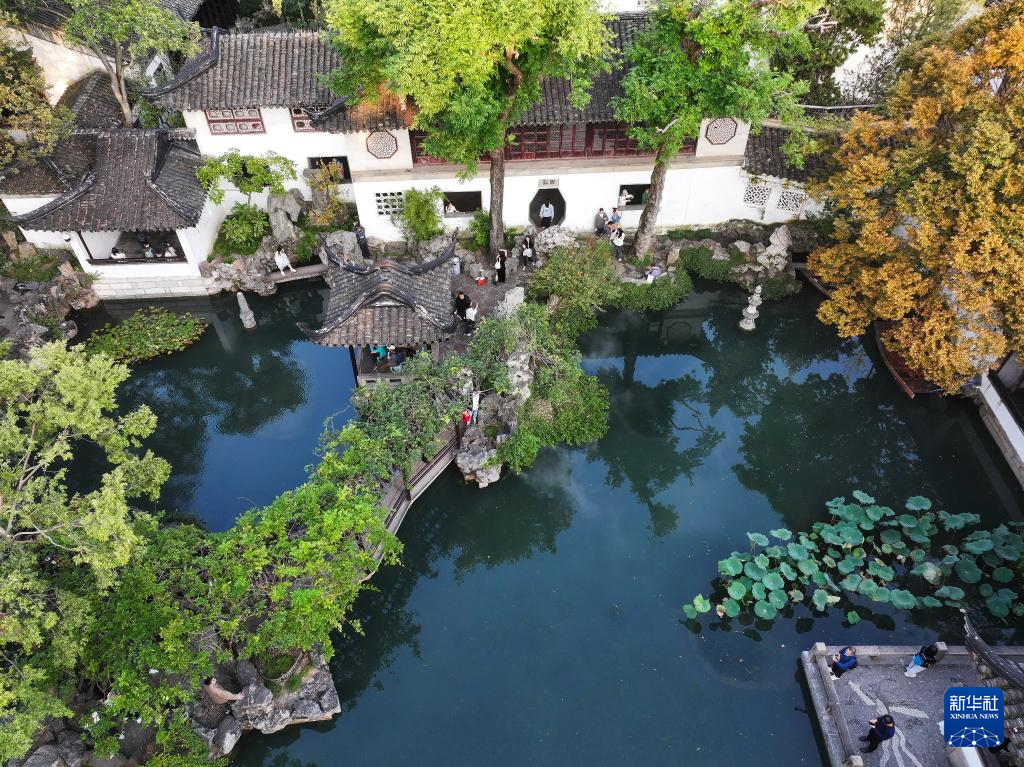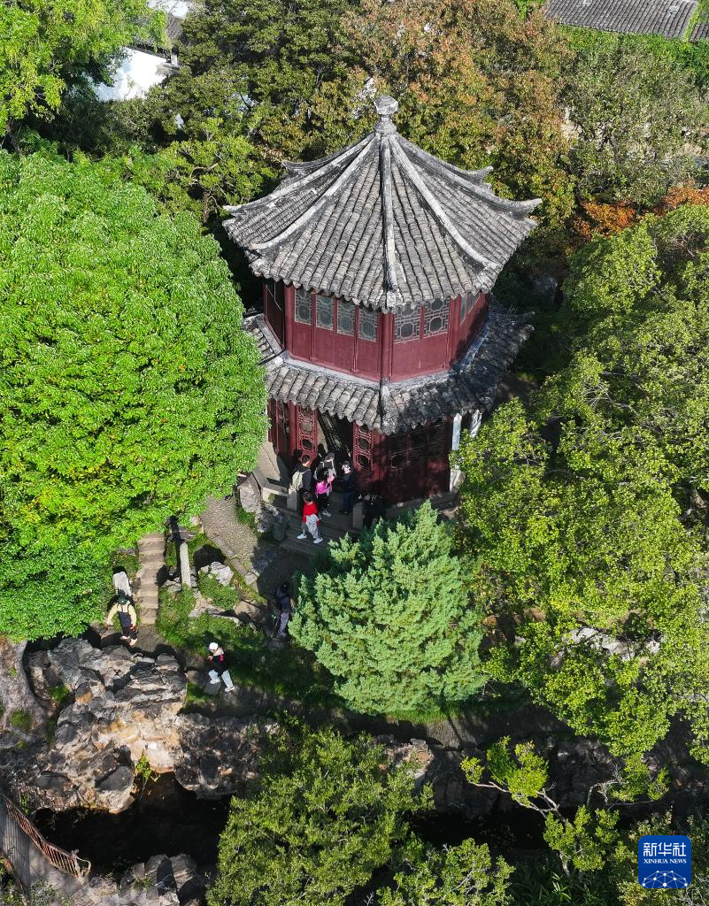 游人在拙政園內游覽(10月23日攝,無人機照片)。