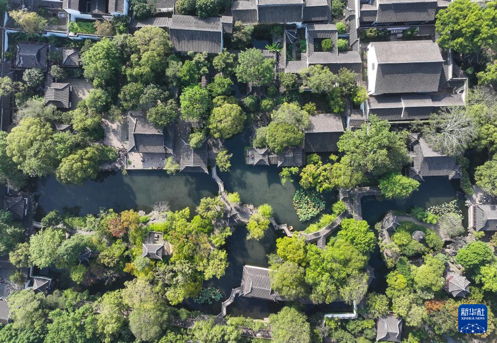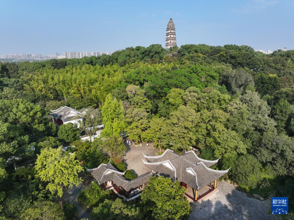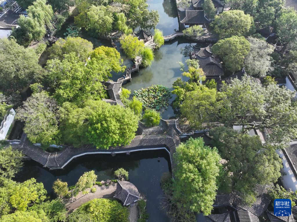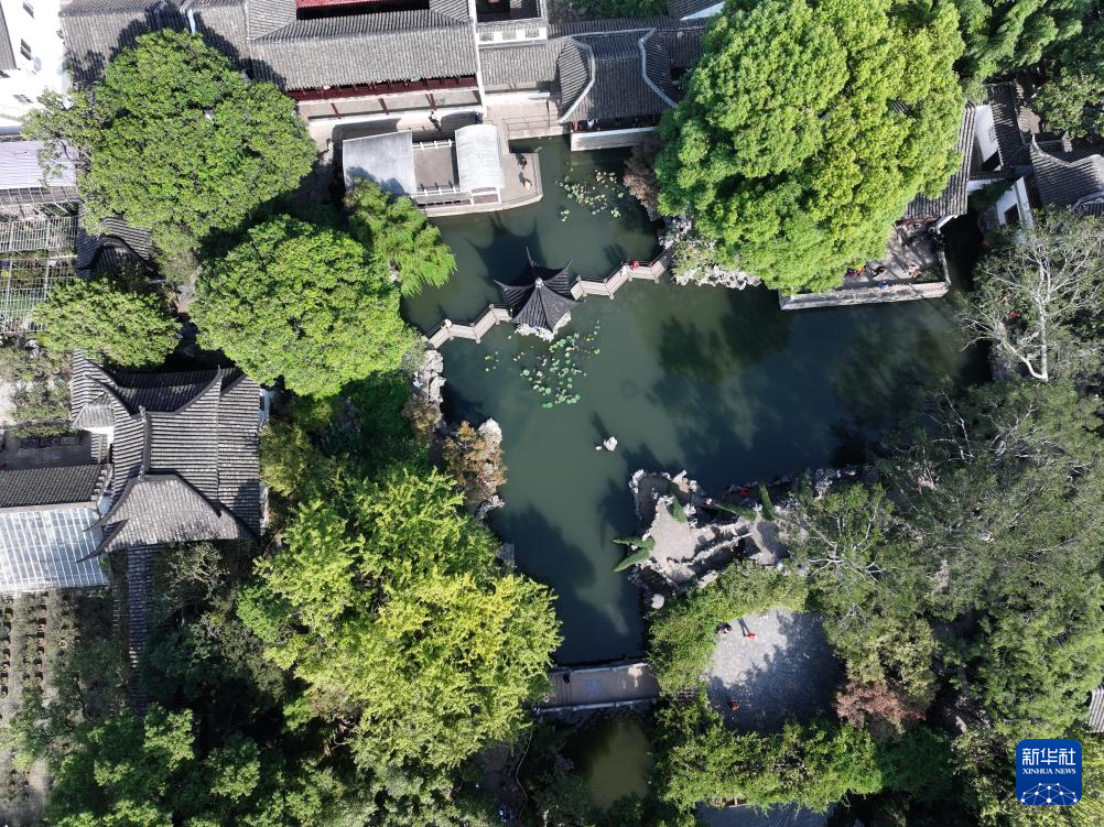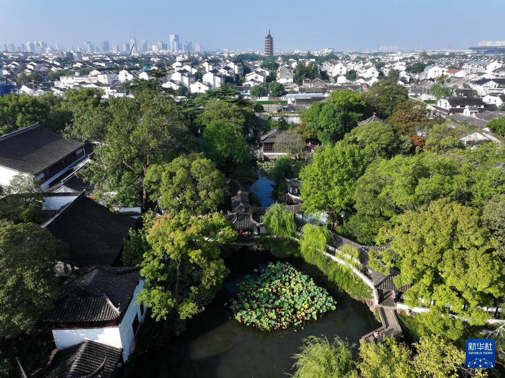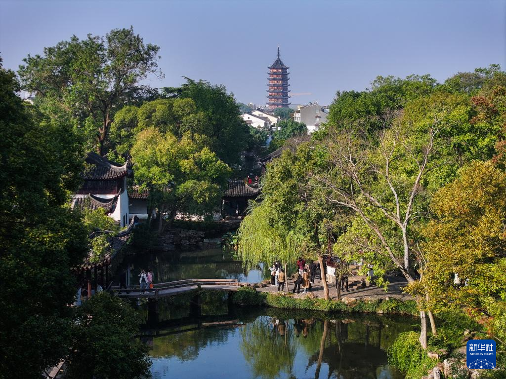 蘇州園林西溪環翠游覽景色(10月23日攝,無人機照片)。西溪環翠位于虎丘西南麓。