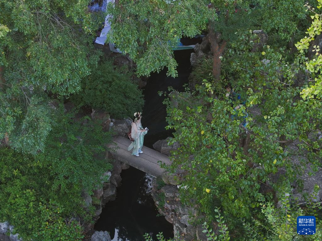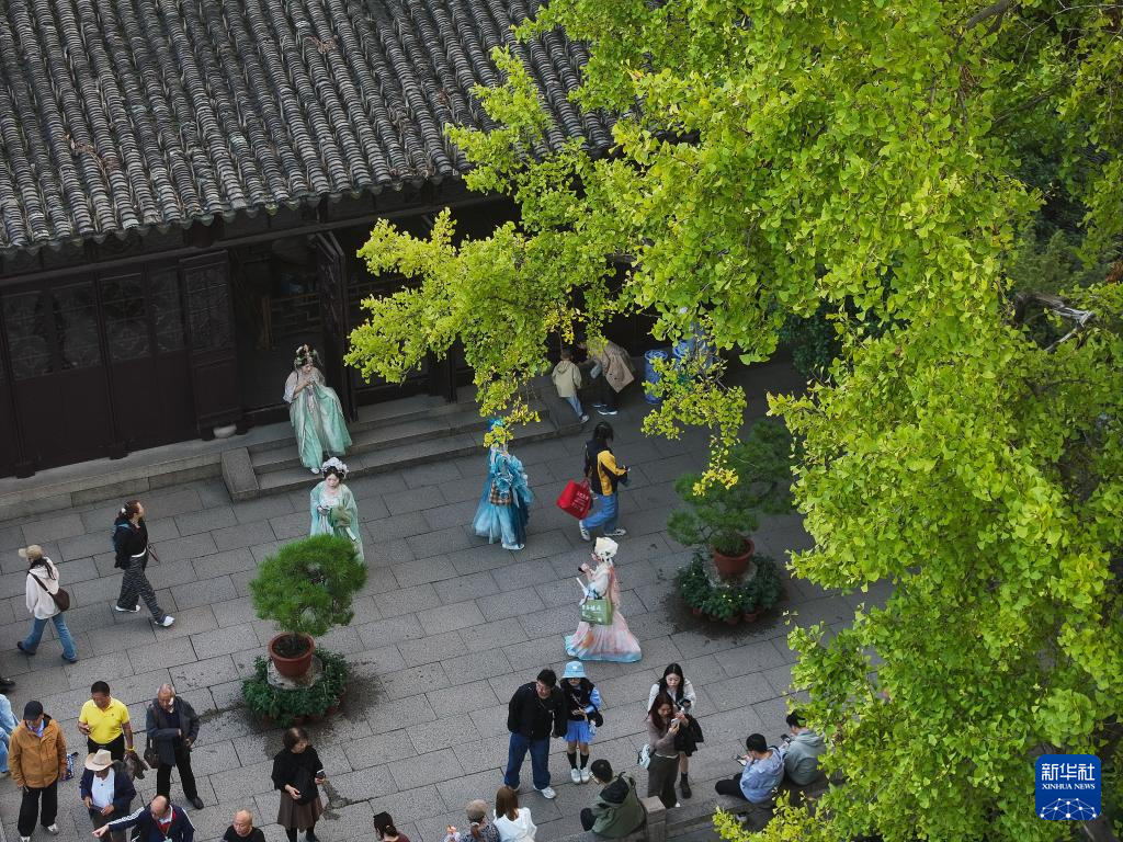 身著古裝的游客在留園參觀游覽(10月23日攝,無人機照片)。