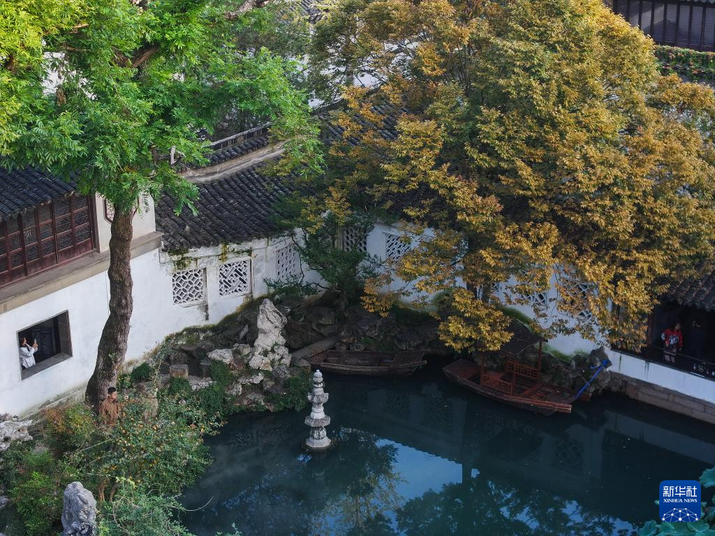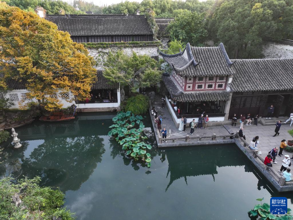 游人在蘇州園林西溪環翠游覽(10月23日攝,無人機照片)。
