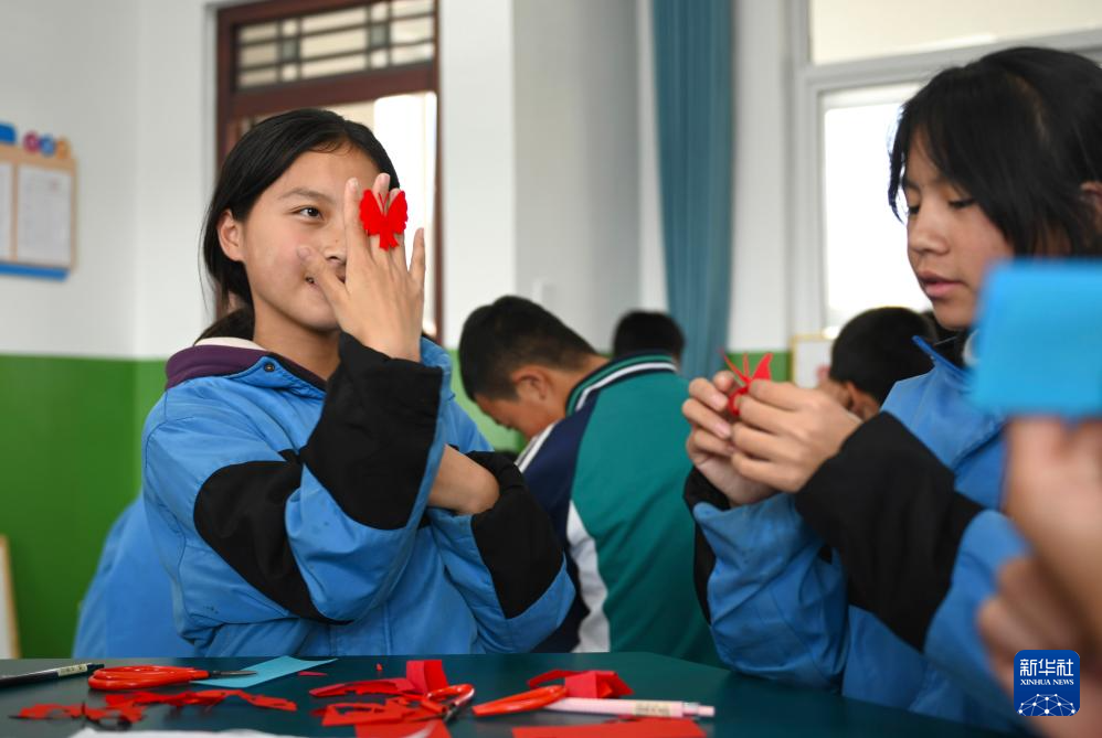 11月1日,在固原市隆德縣楊河中學,學生在課堂上剪紙。