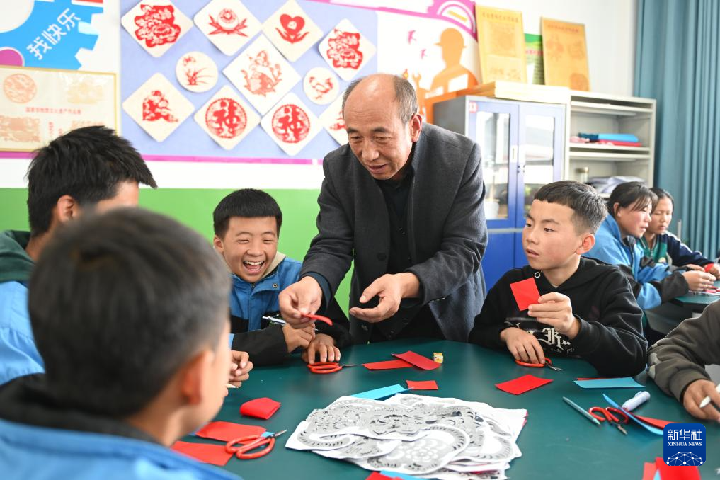 11月1日,寧夏回族自治區非遺剪紙項目傳承人王生貴(中)在固原市隆德縣楊河中學指導學生剪紙。