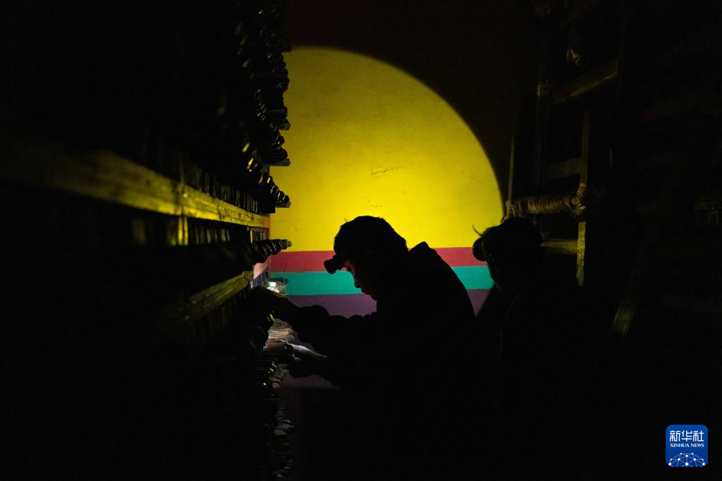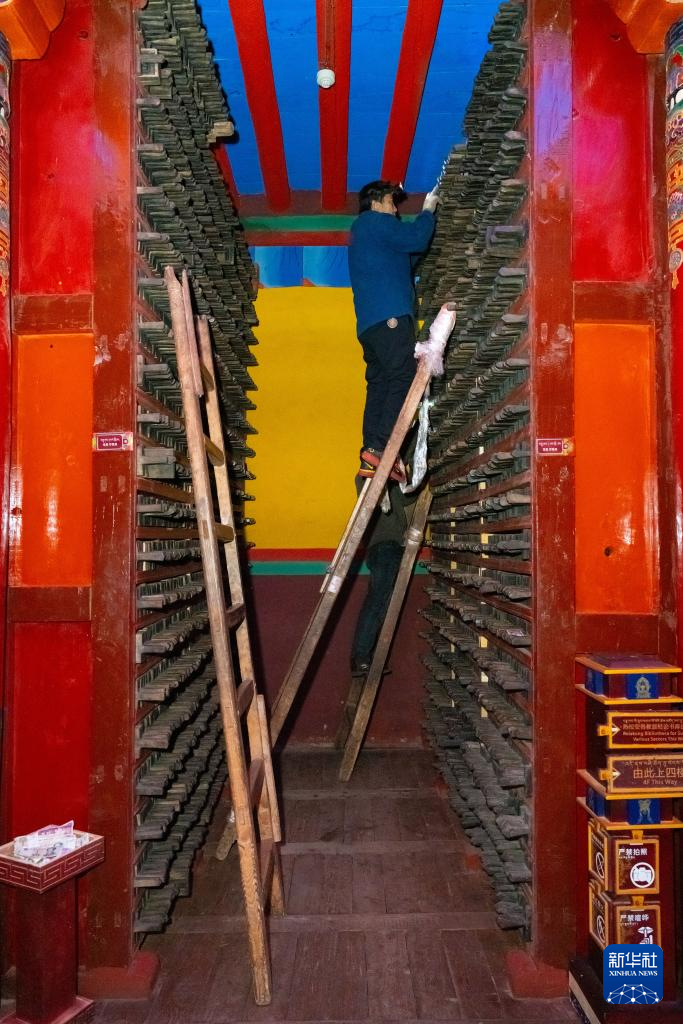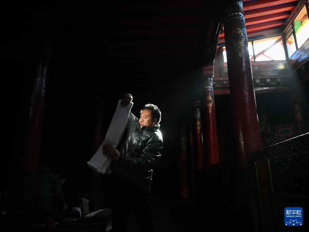 11月2日,德格印經院的工人在晾剛印完的印刷品。