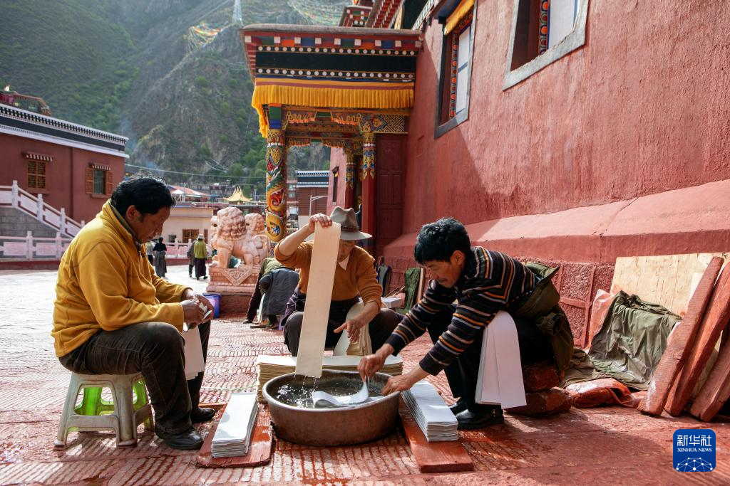 工人在德格印經院外浸泡用于印刷的紙張(2017年5月16日攝)。