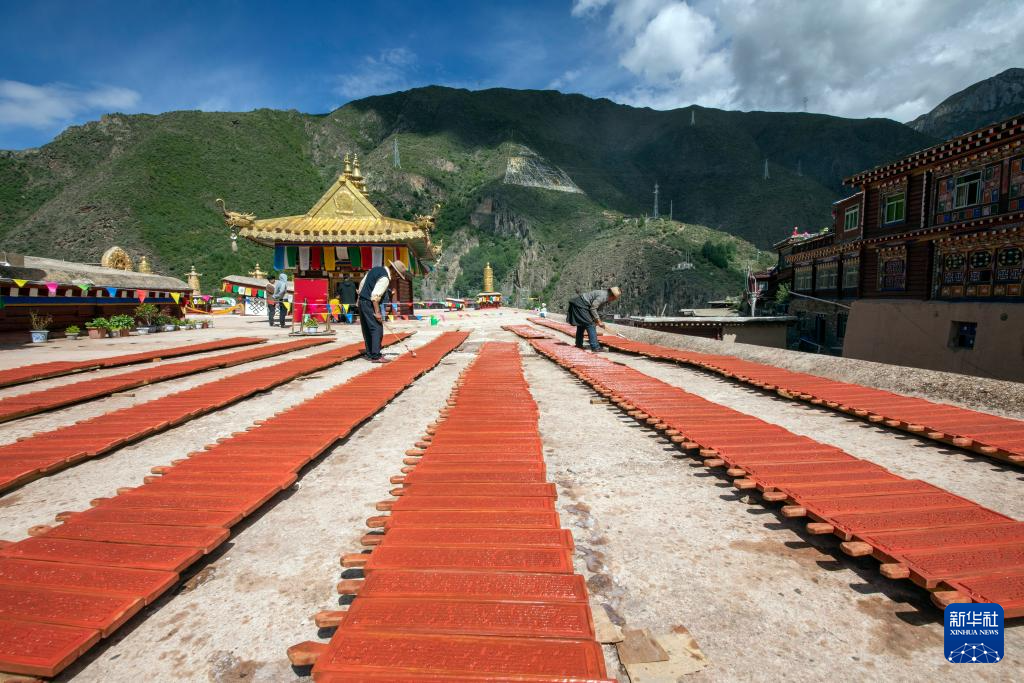 工人在德格印經院的樓頂晾曬院藏印版(2019年6月11日攝)。