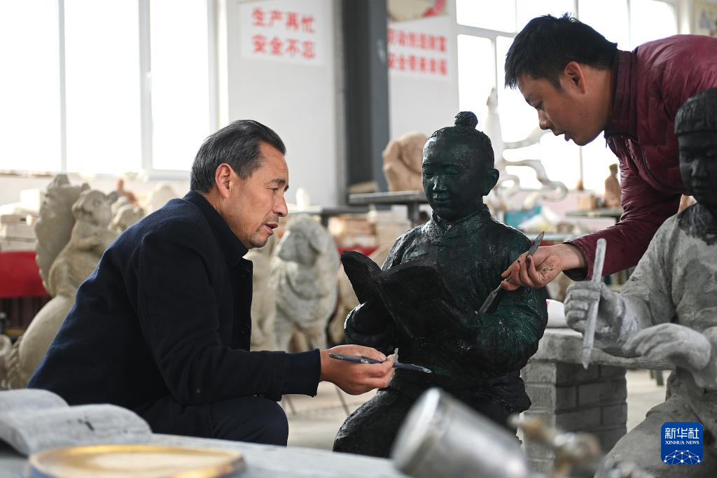 10月31日,楊佳年(左)在隆德縣楊氏彩塑生產車間對學生進行指導。
