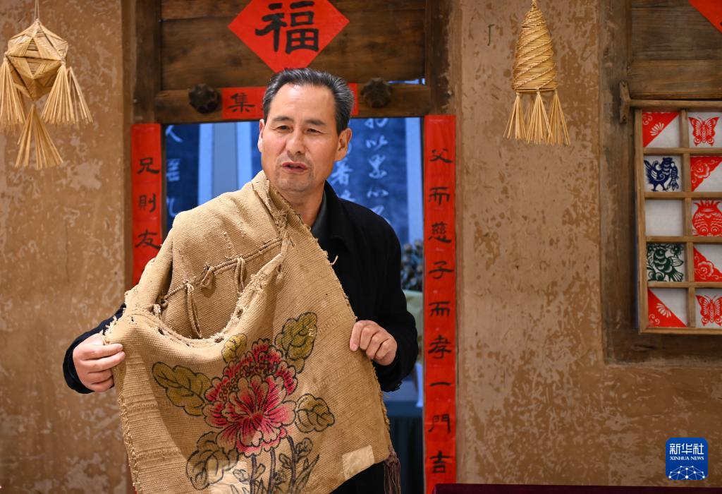 10月31日,在隆德縣楊氏彩塑藝術館,楊佳年展示父輩非遺傳承人的外出工具袋。
