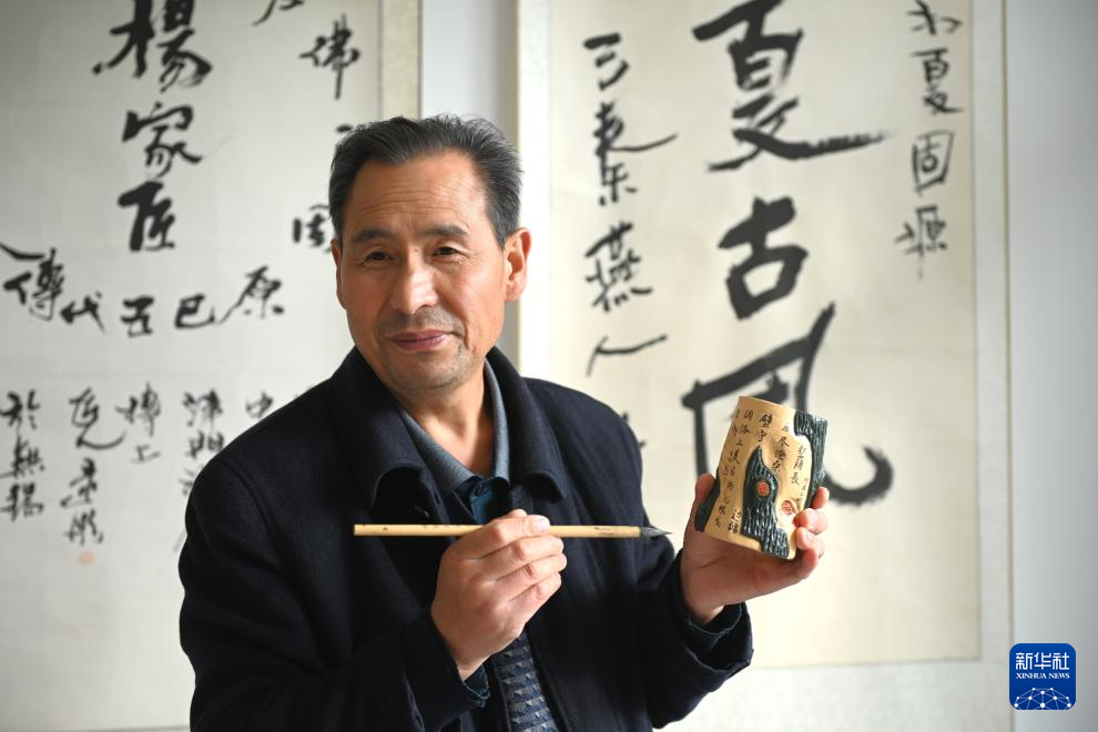 10月31日,楊佳年在隆德縣楊氏彩塑藝術館展示彩塑筆筒。