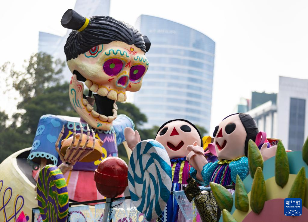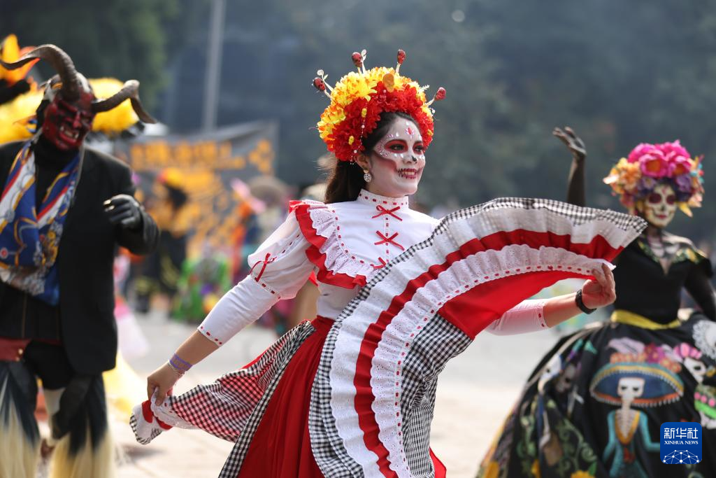 這是11月2日在墨西哥首都墨西哥城拍攝的亡靈節游行現場。