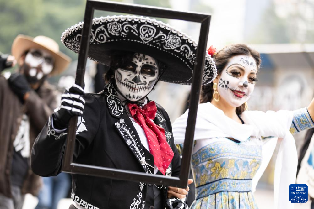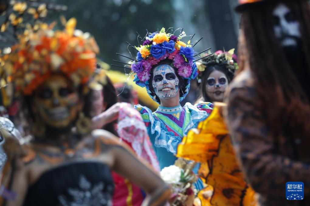 這是11月2日在墨西哥首都墨西哥城拍攝的參加亡靈節游行的演員。