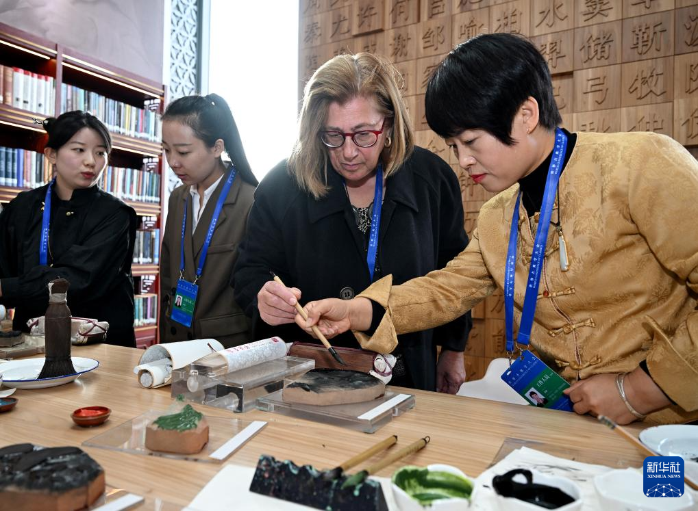 11月7日,一名外國觀眾(右二)在展臺前體驗“榮寶齋木版水印技藝”非遺項目。