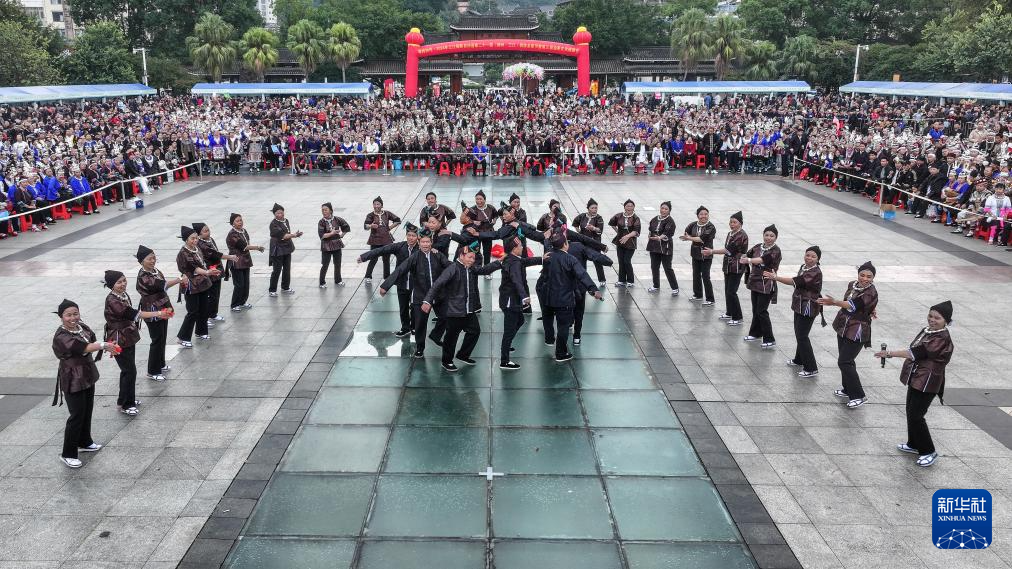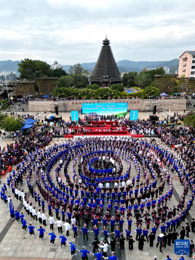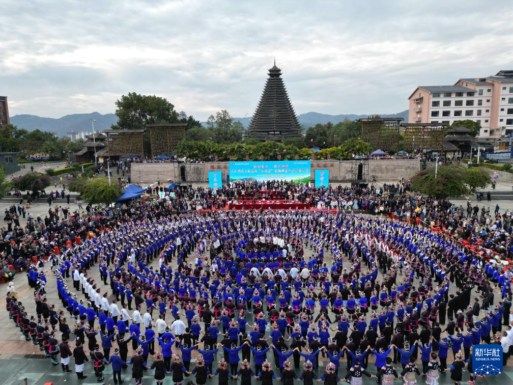 11月9日,侗族群眾聚集廣西三江侗族自治縣多耶廣場,跳千人多耶,慶祝侗族傳統多耶節(無人機照片)。