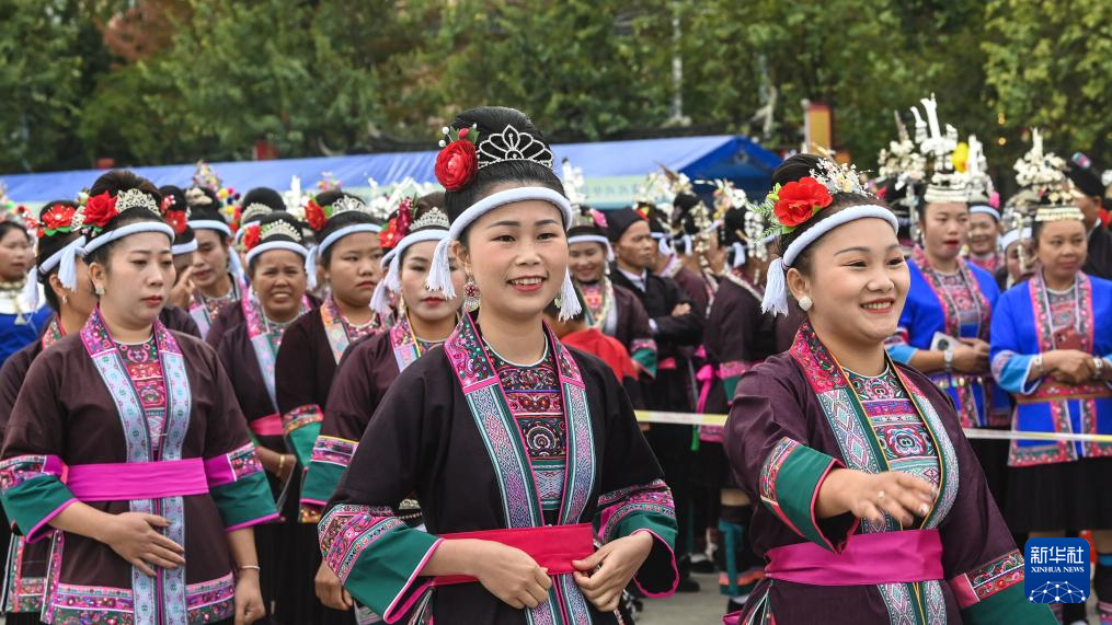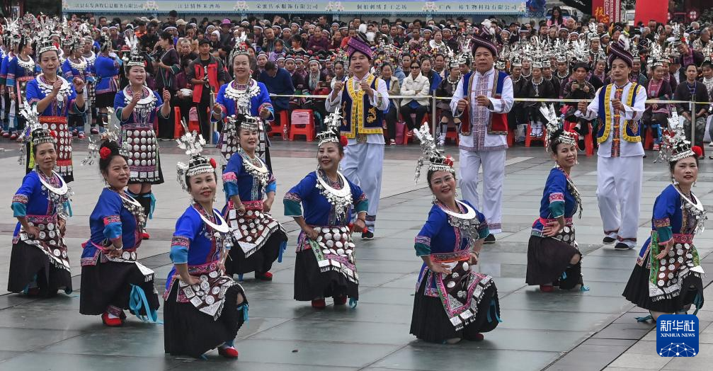 當日,湘黔桂三?。▍^)侗族群眾聚集在廣西三江侗族自治縣多耶廣場,載歌載舞,歡慶侗族多耶節。