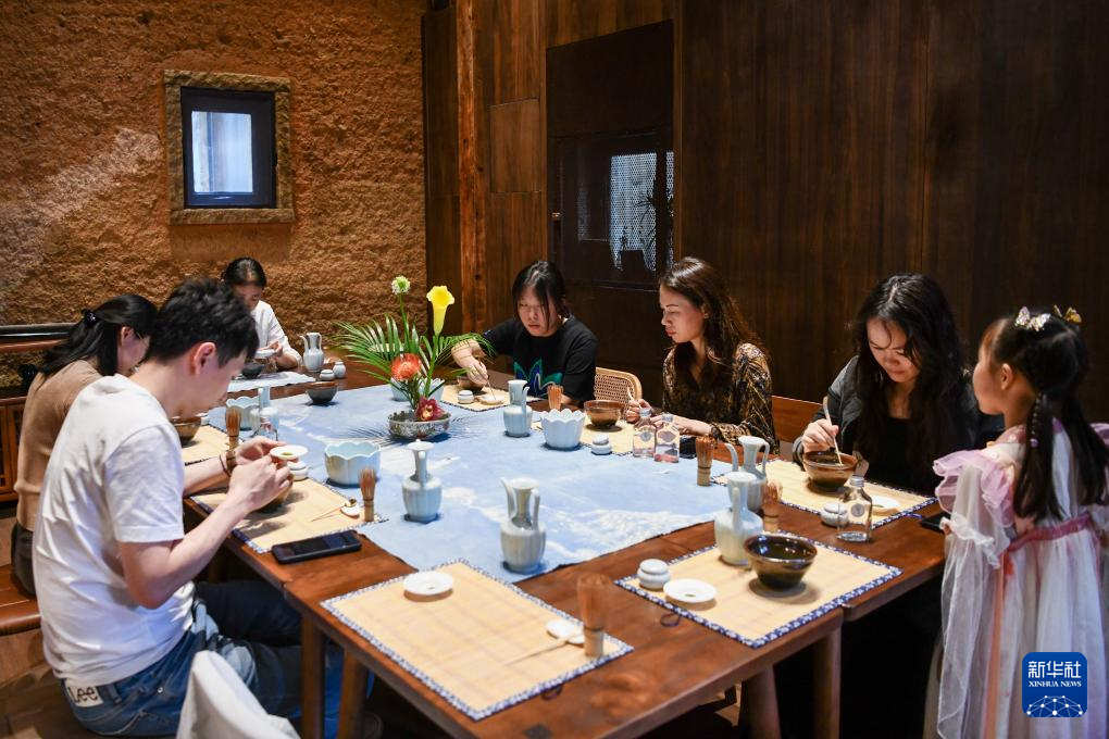 游客在長守戲劇谷里體驗制作抹茶(11月9日攝)。