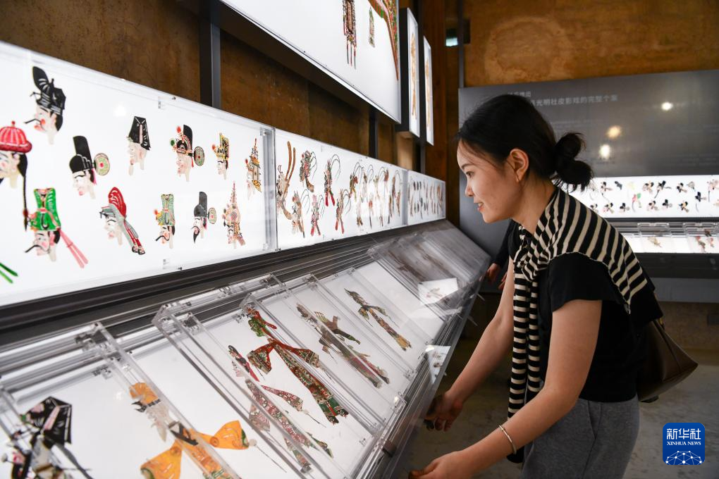 一名游客在長守戲劇谷里參觀了解皮影戲(11月9日攝)。
