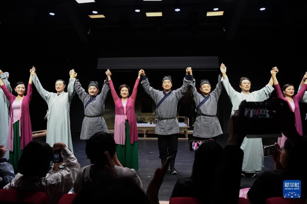 11月9日,在長守戲劇谷,張國立(中)等演員在話劇《我愛桃花》演出結束后謝幕。