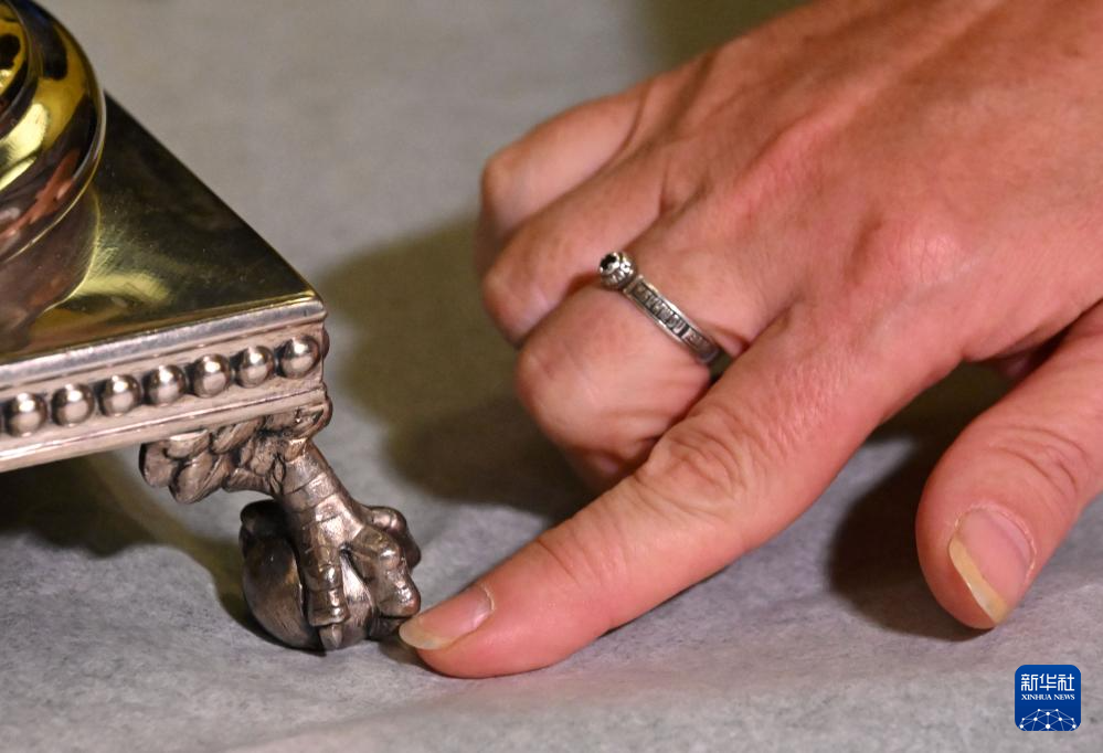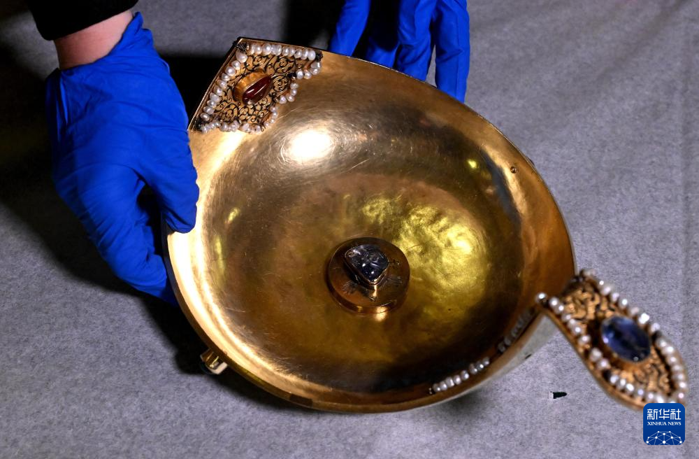 這是即將展出的船形杯局部(11月13日攝)。船形杯是古代俄羅斯最具特色的容器之一。在宴會上,船形杯被用來盛放最受歡迎的俄羅斯飲料——蜂蜜或蜂蜜酒。