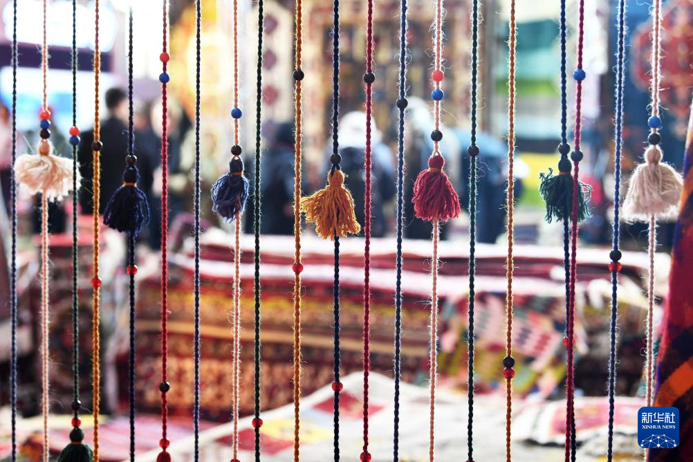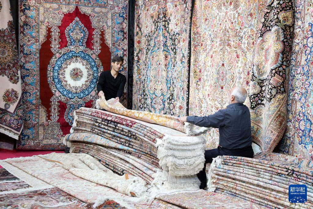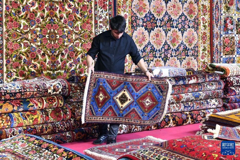 11月14日,在伊朗首都德黑蘭,伊朗國際手工地毯展的參展商整理地毯。