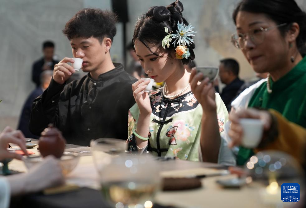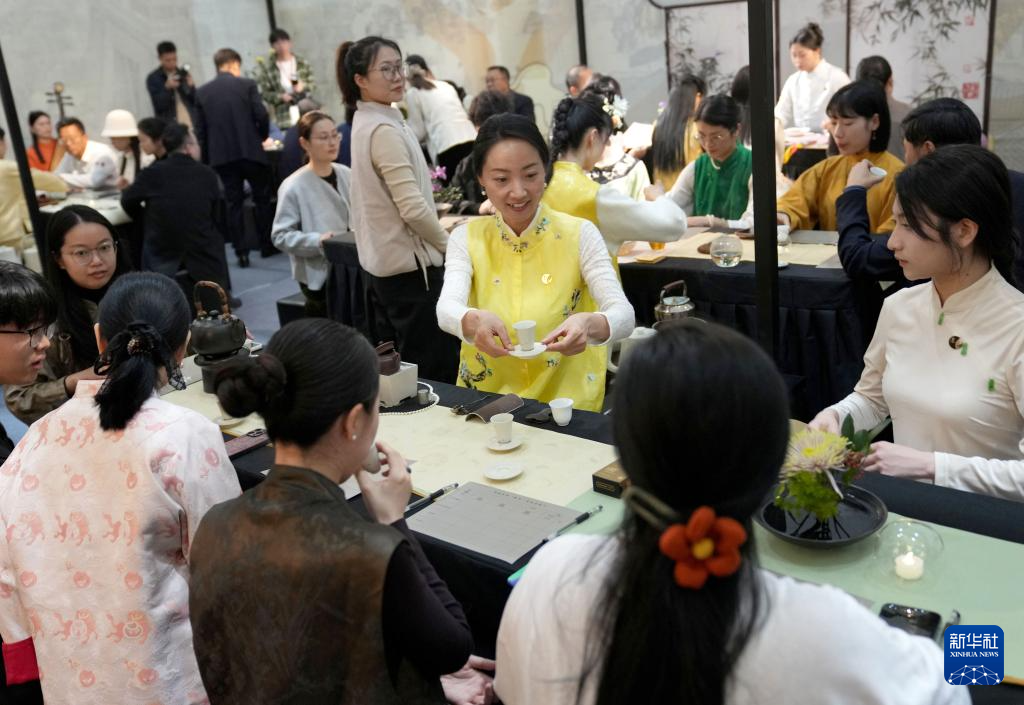 11月14日,人們在杭州秋季茶博會上舉行的一場茶會中品茶。