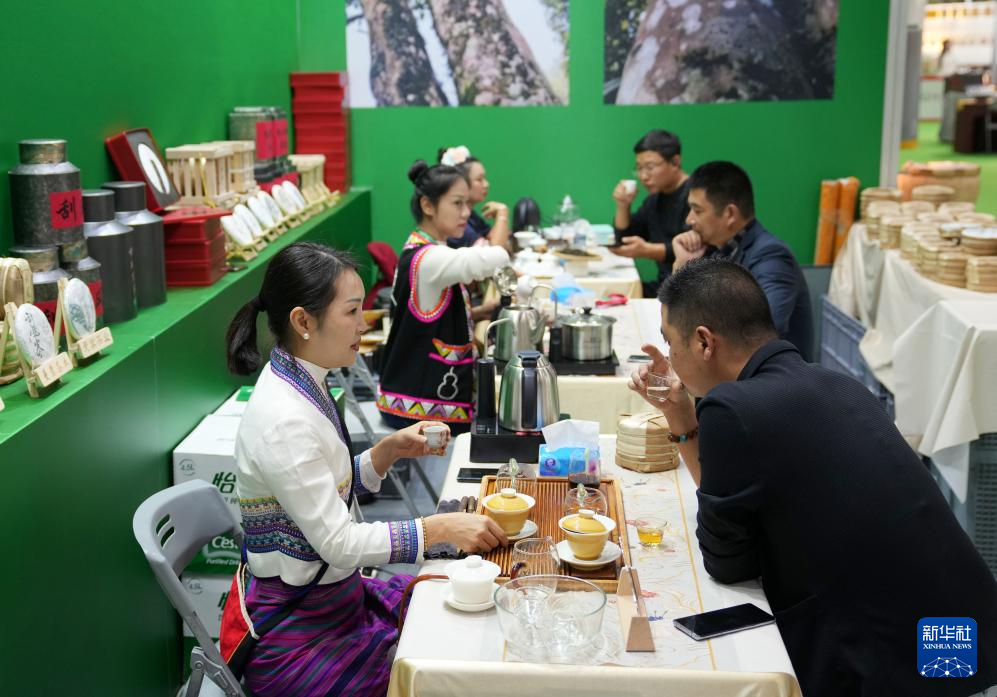 11月14日,人們在杭州秋季茶博會一家參展商展位上品茶。