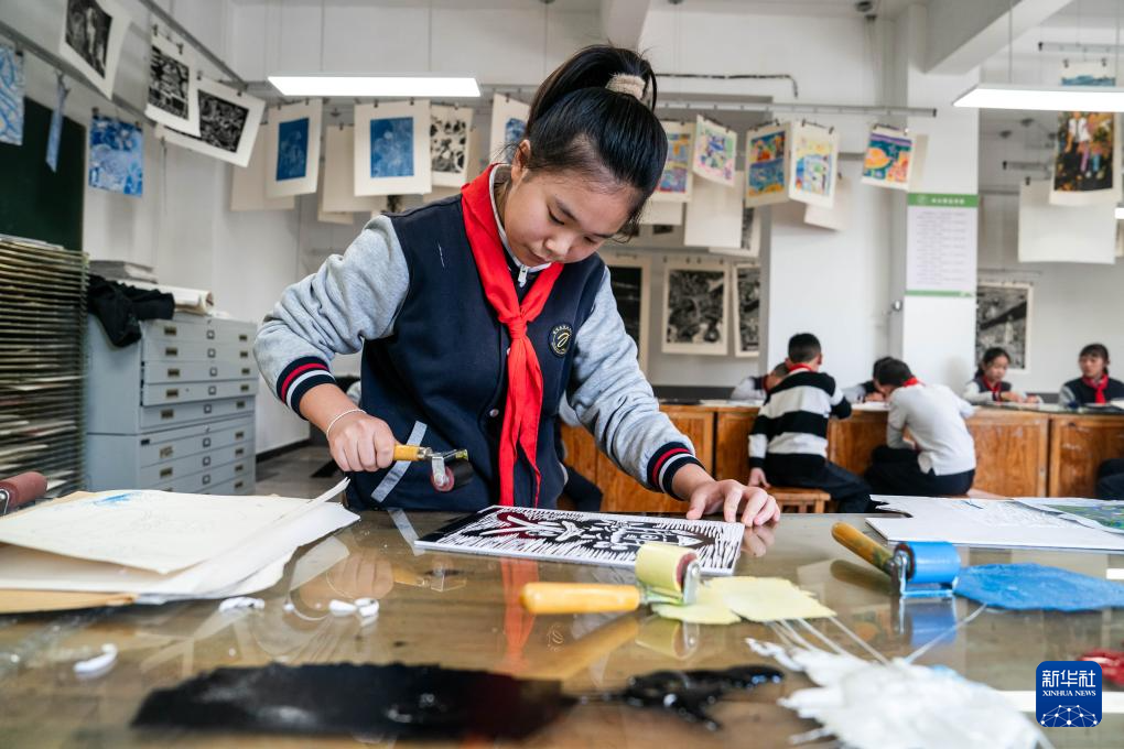 11月12日,曲靖市第二小學的學生在創作當地特色的爨文化版畫作品。