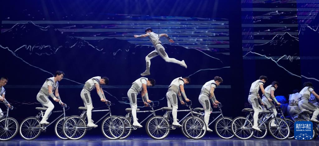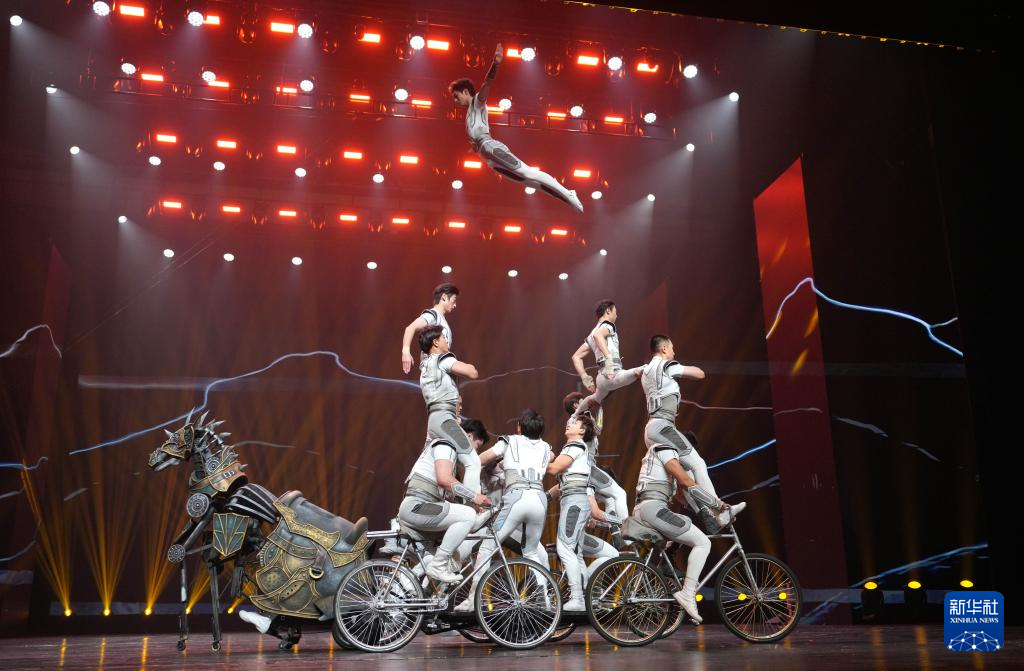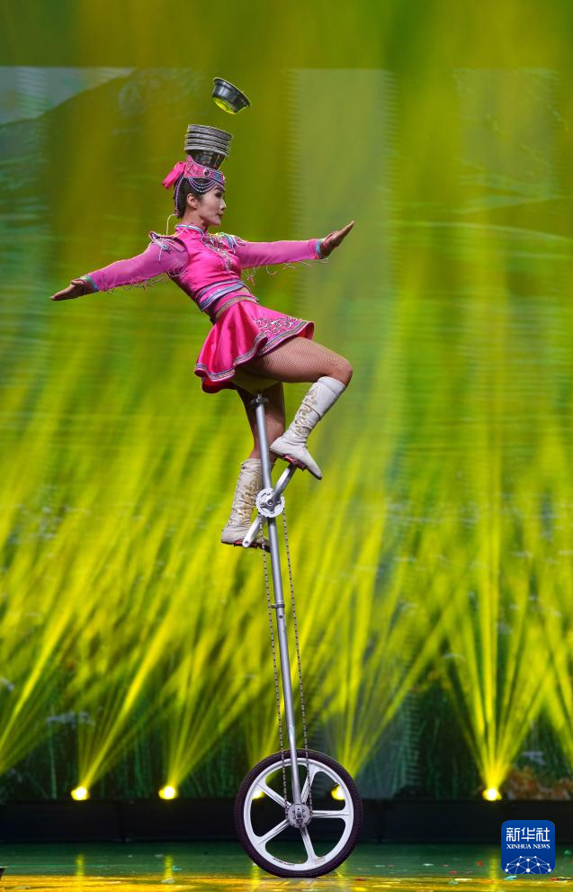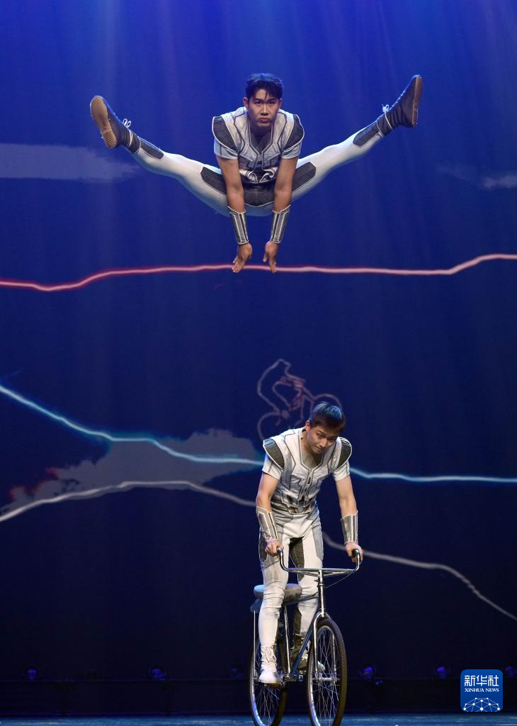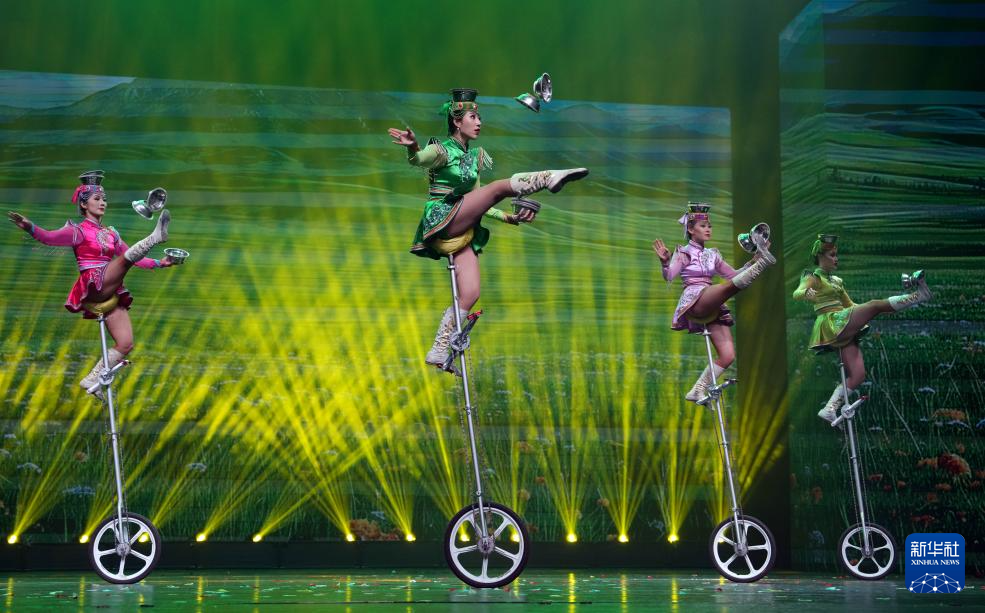 11月15日,在北京保利劇院舉行的“金菊競芳——新時代全國優秀雜技節目展演”上,內蒙古藝術劇院雜技團演員表演雜技《高車飛碗》。