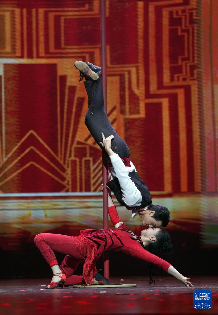 11月15日,在北京保利劇院舉行的“金菊競芳——新時代全國優秀雜技節目展演”上,上海雜技團有限公司演員表演雜技《戰上?!p人爬桿》。