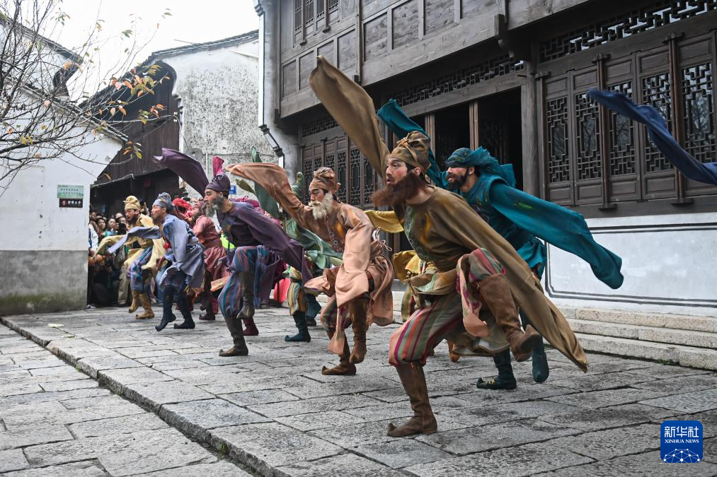 11月16日,浙江音樂學院演員在新市古鎮表演《十八煥蝶》民間舞。