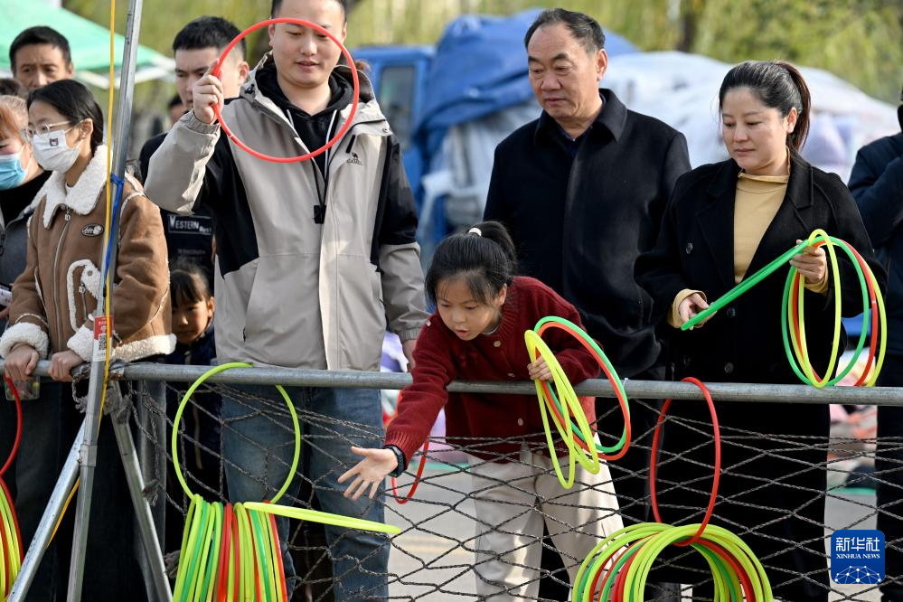 11月24日,家長帶著小朋友在蕭縣“十月古會”上套圈。