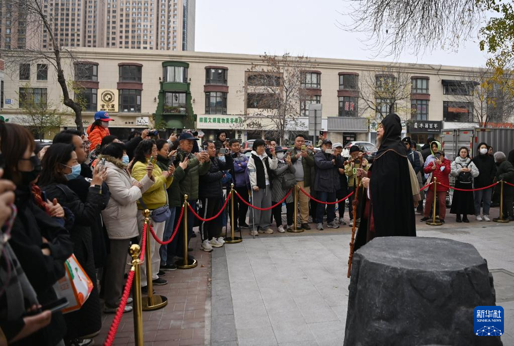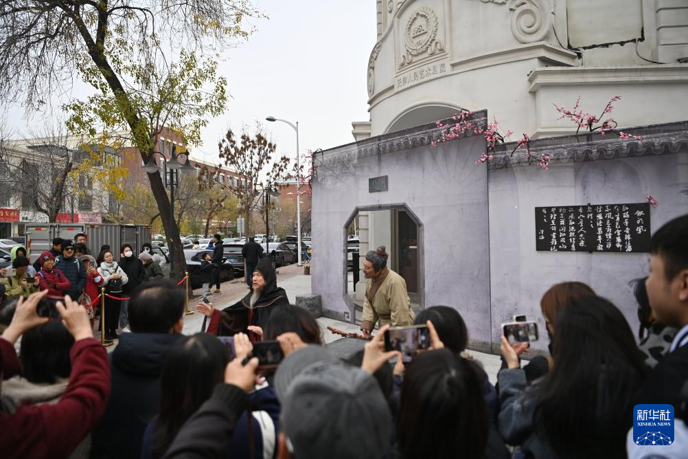 當日,天津人民藝術劇院經典話劇《釵頭鳳》片段在劇院門口的街角上演,讓市民游客感受天津城市文化魅力。據了解,話劇《釵頭鳳》講述了詩人陸游的一段人生經歷。