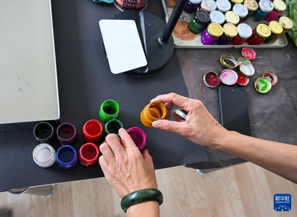 11月5日,李昕桐在土耳其伊斯坦布爾的家中測試水拓畫顏料。