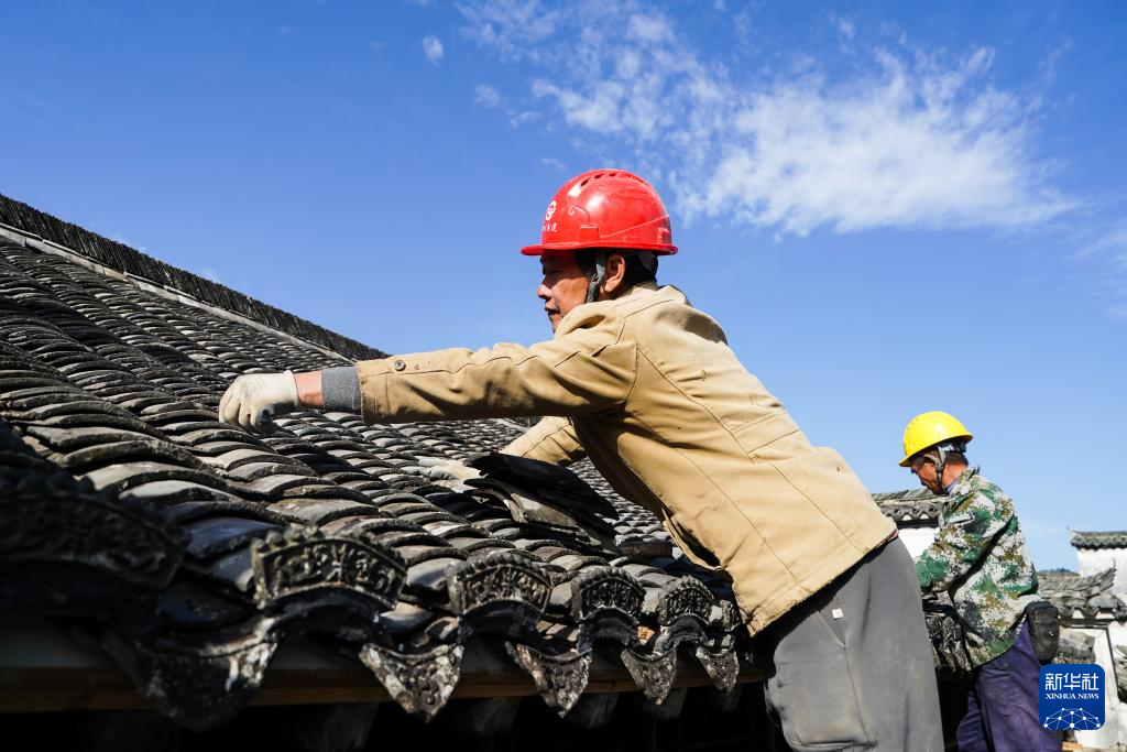 11月26日,維修工人在黃山市黟縣西遞村追慕堂對房屋瓦片進行整理。