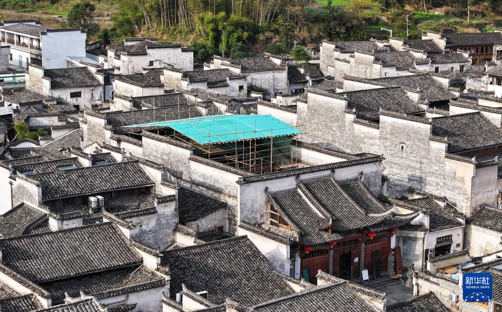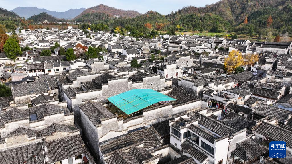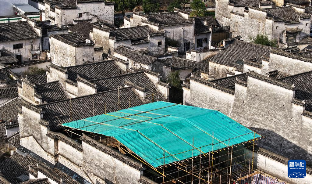 這是11月26日在黃山市黟縣西遞村拍攝的正在封閉維修中的追慕堂(無人機照片)。