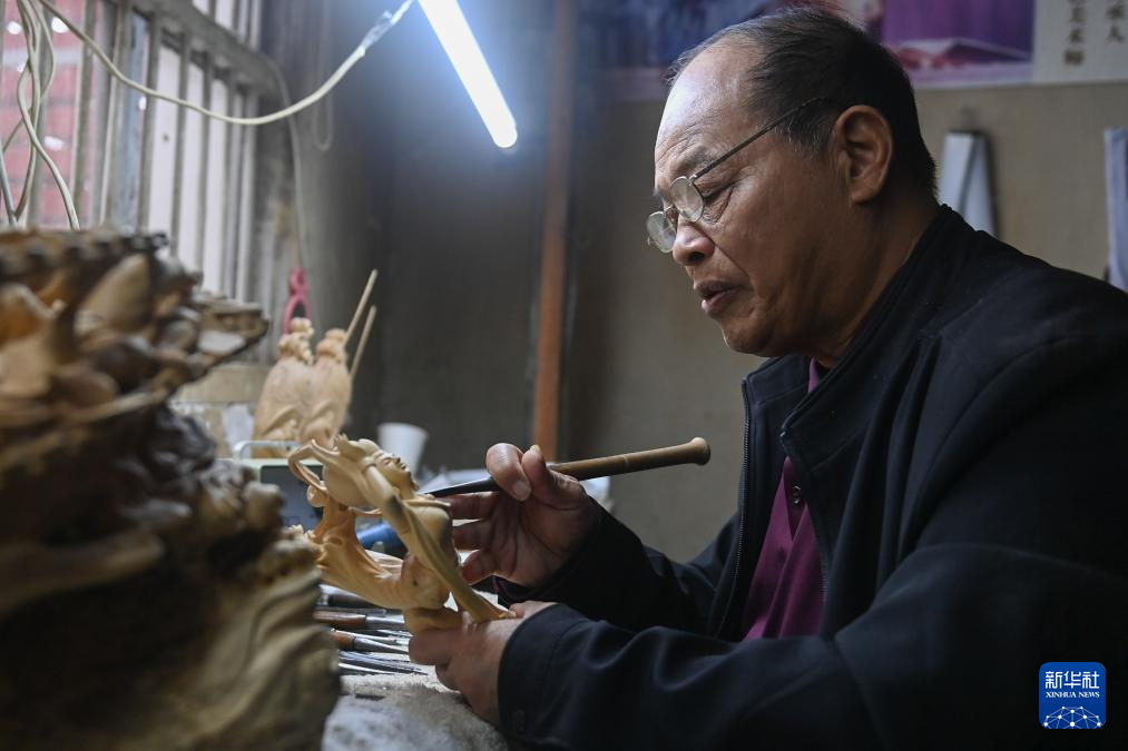 虞金順在工作室雕刻一件樂清黃楊木雕作品(11月25日攝)。