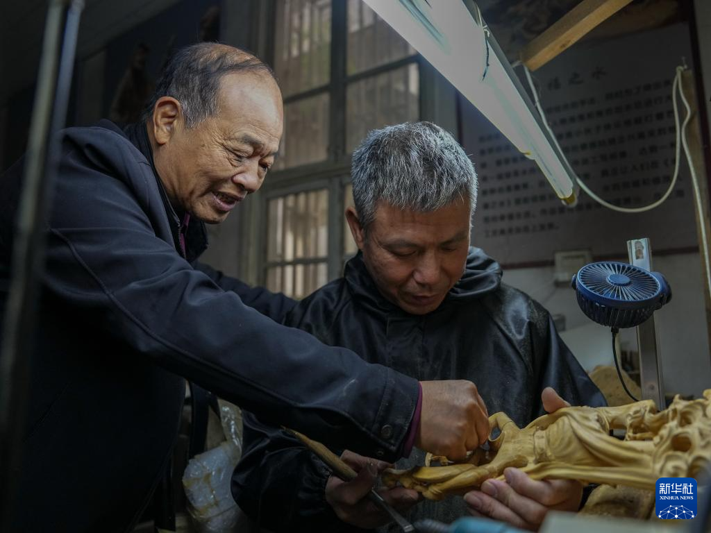 虞金順(左)在工作室指導學生李毅雕刻(11月25日攝)。