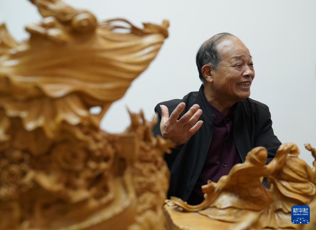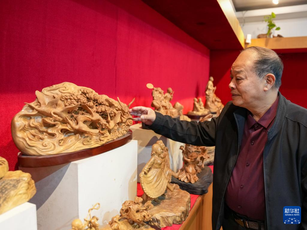 虞金順在工作室展示自己創作的樂清黃楊木雕作品(11月25日攝)。