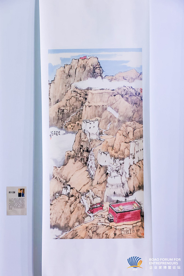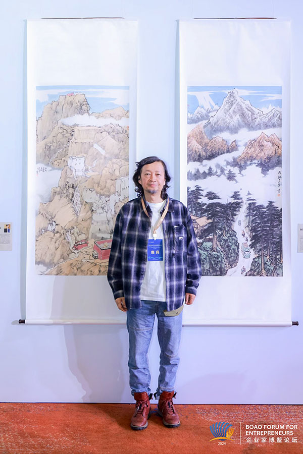 “我創作的畫作《欲辨已忘言》,名字取自陶淵明的詩句,這里面有仙人駕飛馬、有鳳凰翱翔,樹上有鳥,也有很多游人在山水間品茶飲酒,在廊橋之下村民在閑聊,還有放牧的牧人等等——這樣美好的世界,正寄托著我對中華藝術美好的未來愿景?!焙渭恿终f。